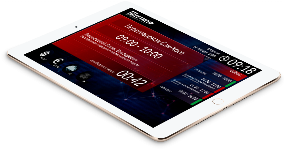 Отображает наименование текущего совещания и статус занятости переговорной комнаты.